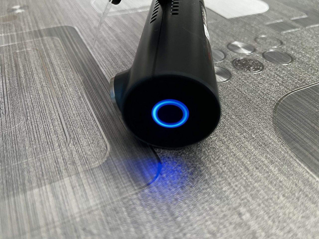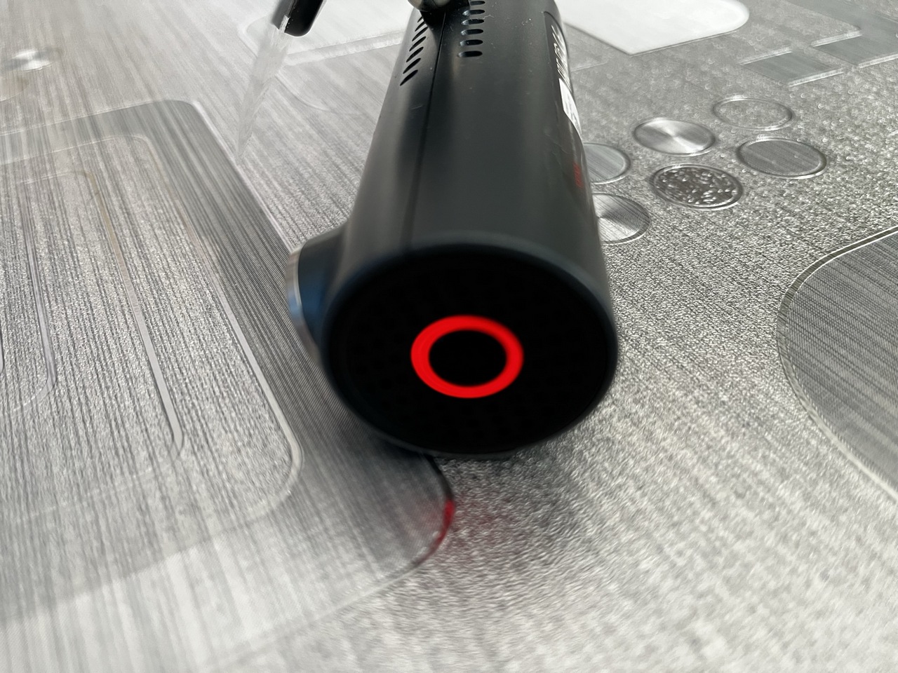 Wskaźnik kamery samochodowej ma kształt pierścienia i otacza przycisk zasilania.